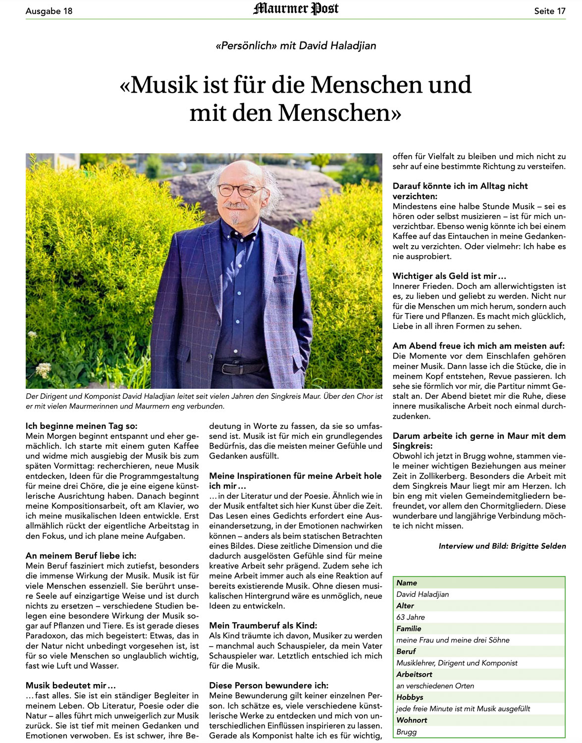 David Haladjian leitet seit 1999 den Singkreis Maur, seit 1995 den Kirchenchor Pfäffikon ZH und seit 2013 den Kammerchor Akusma in Baden.